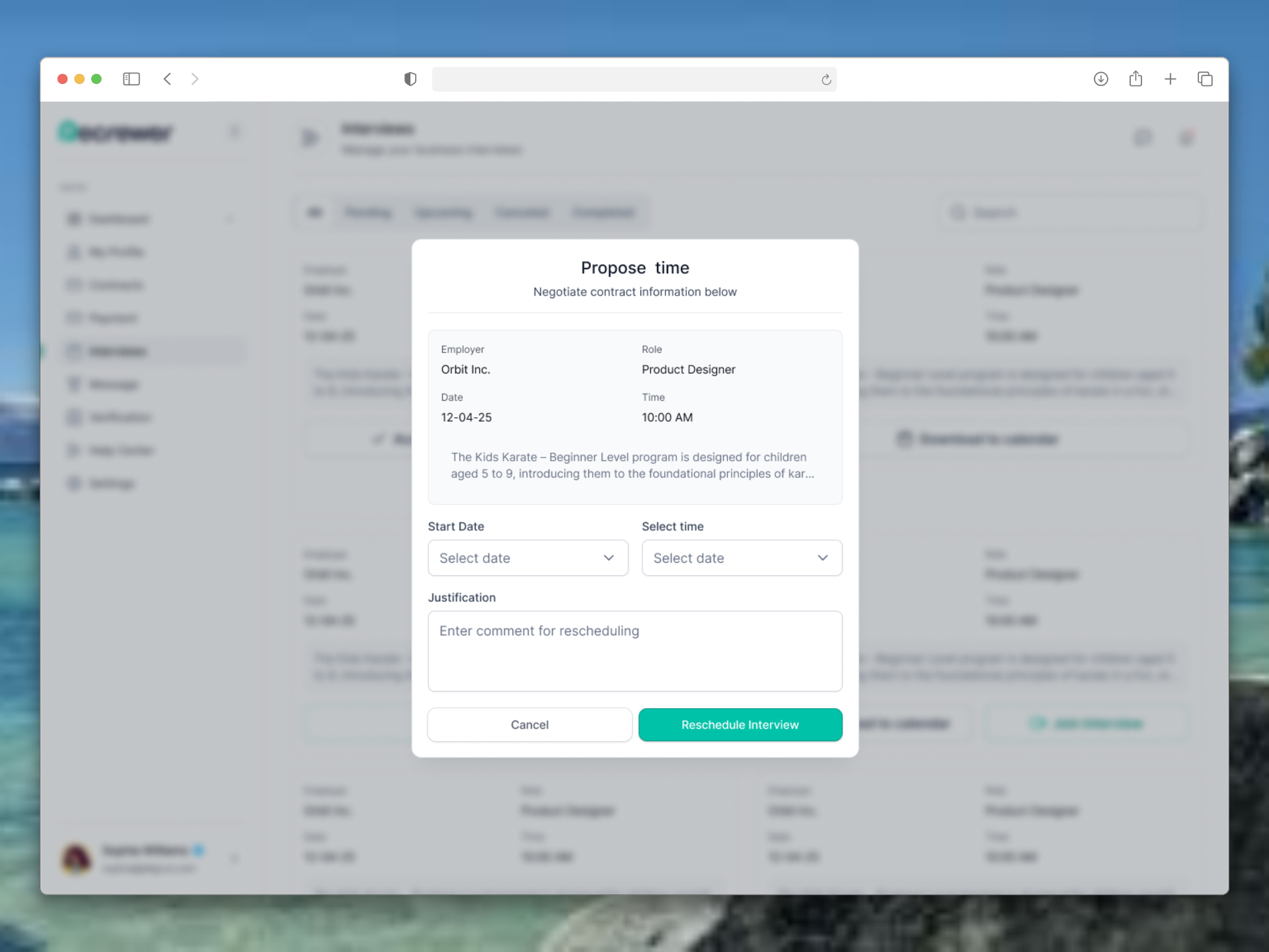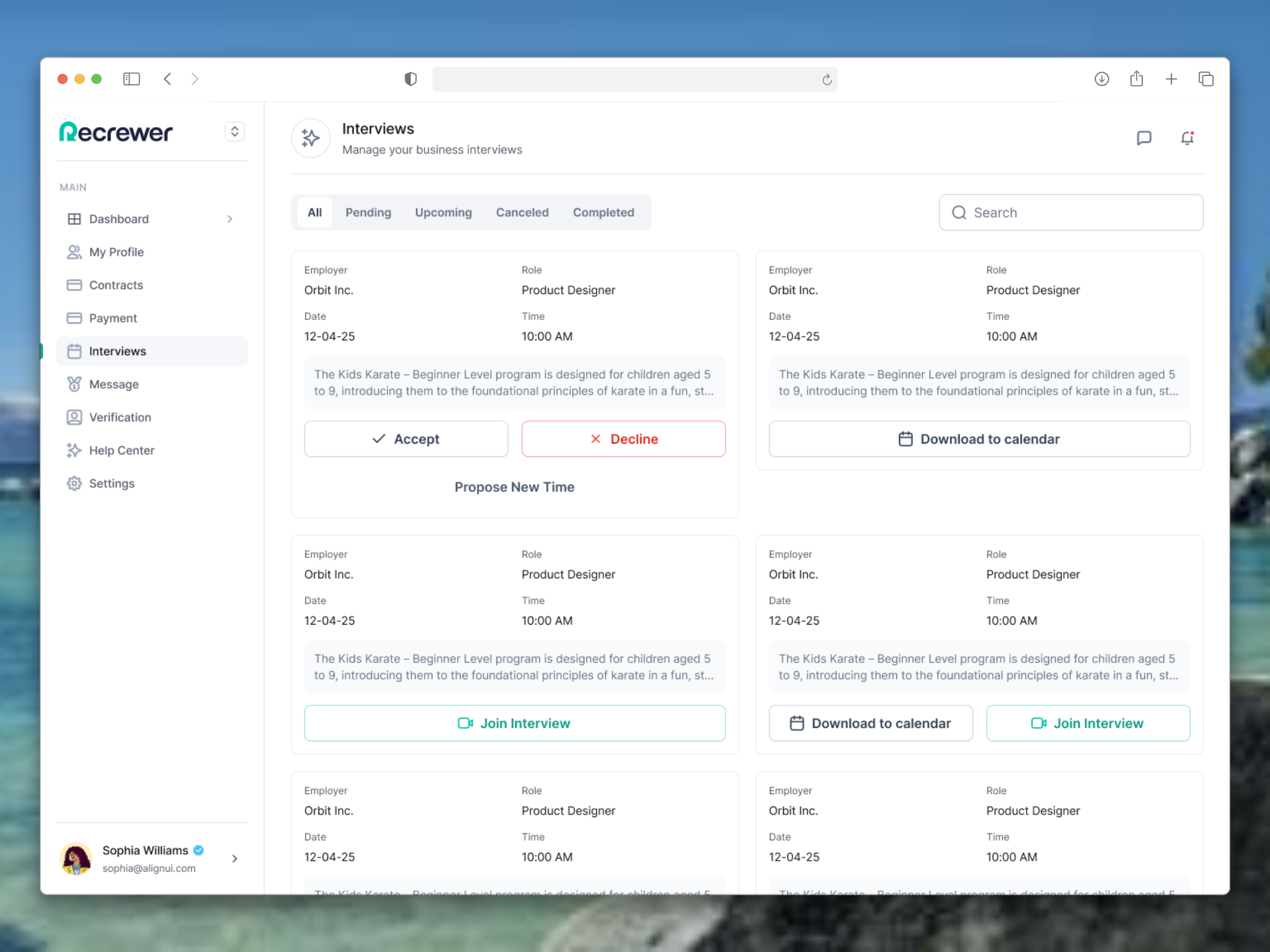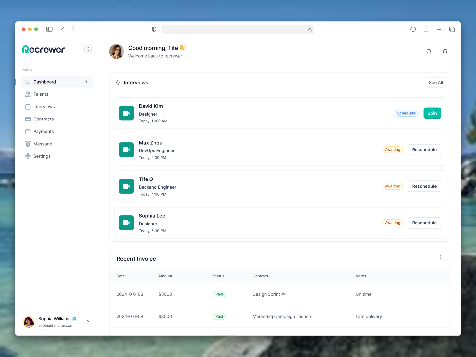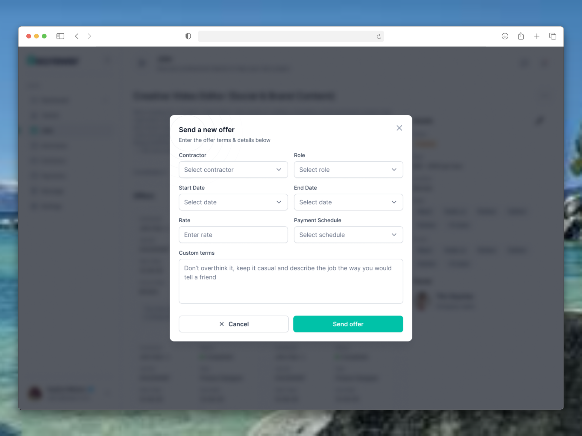Recrewer is a hiring and talent management platform built to help companies discover, interview, hire, and manage contractors in a structured and compliant way. The platform removes the chaos from freelance hiring by centralising discovery, communication, offers, contracts, onboarding, and payments — all while maintaining trust, transparency, and control for both employers and contractors.